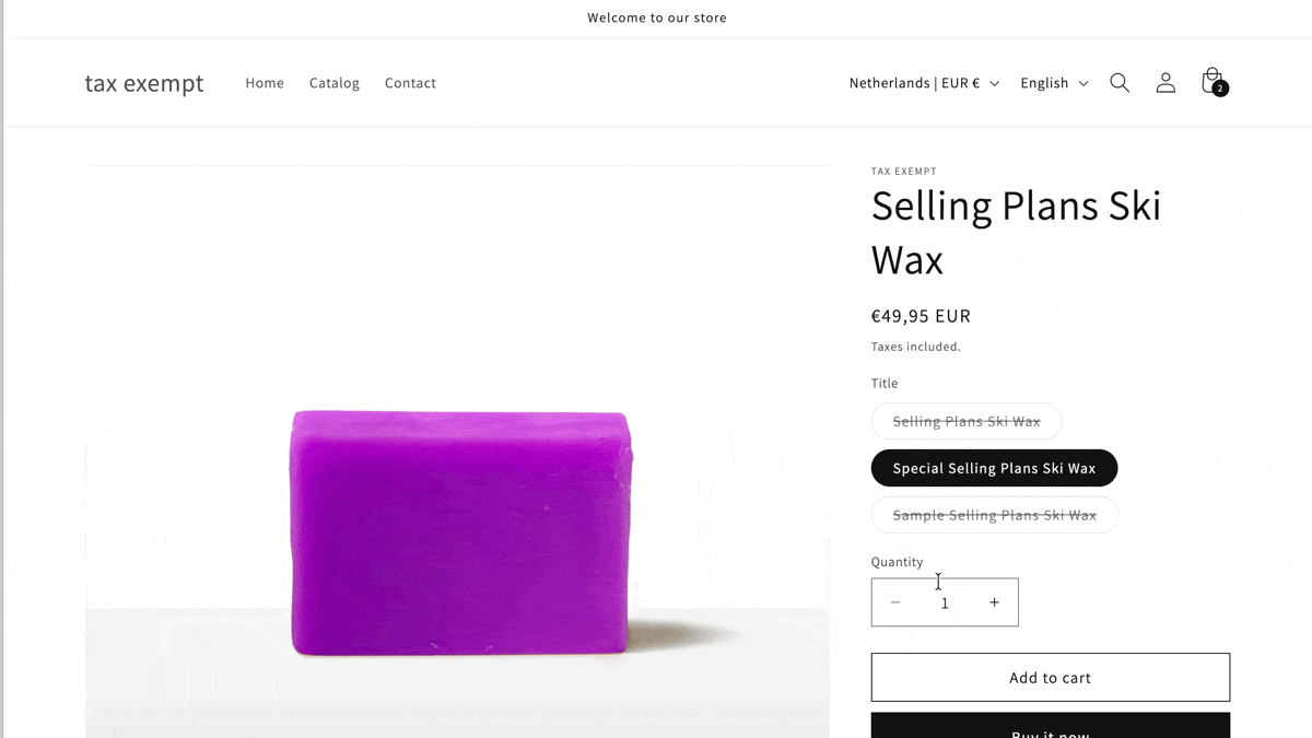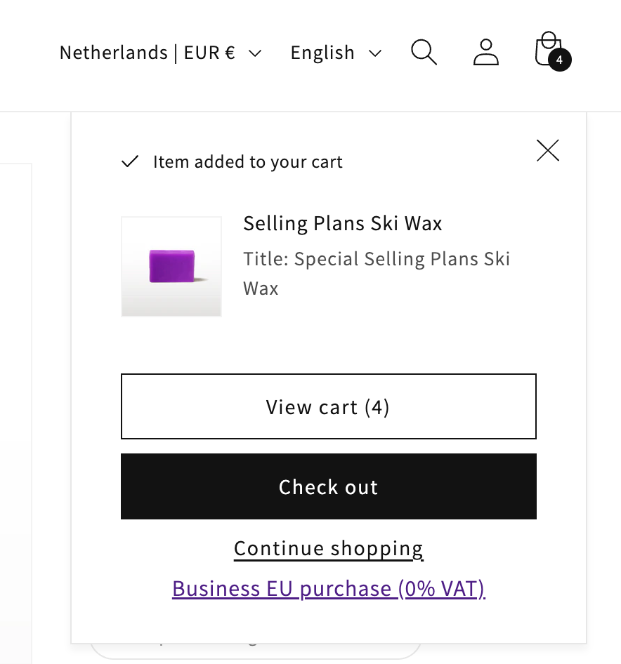 Dan gebeurt er iets handigs: wanneer een klant een product toevoegt aan de winkelwagen, toont Shopify kort de mini winkelwagen. Dit is het perfecte moment om je zakelijke klant te informeren over BTW-vrijstelling.