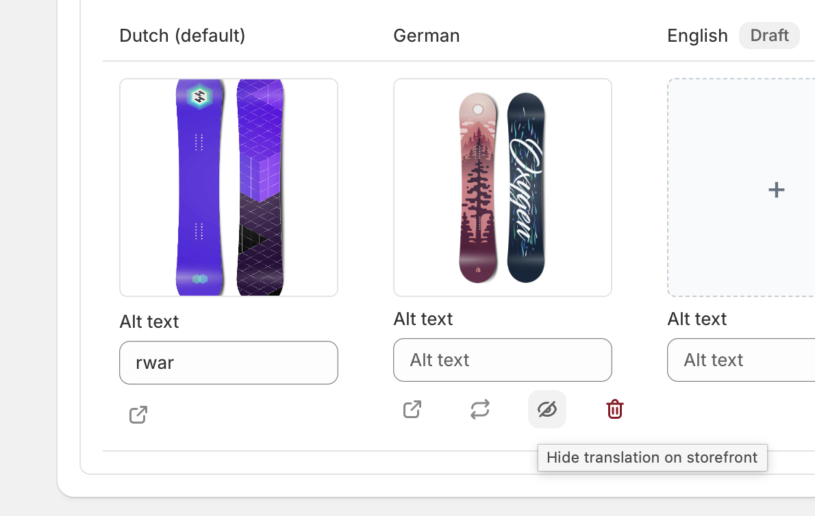 With one click, you can now hide any translated product image for a specific language. The original image stays visible for your primary locale. But for the language where it doesn’t belong? It simply disappears from the storefront.