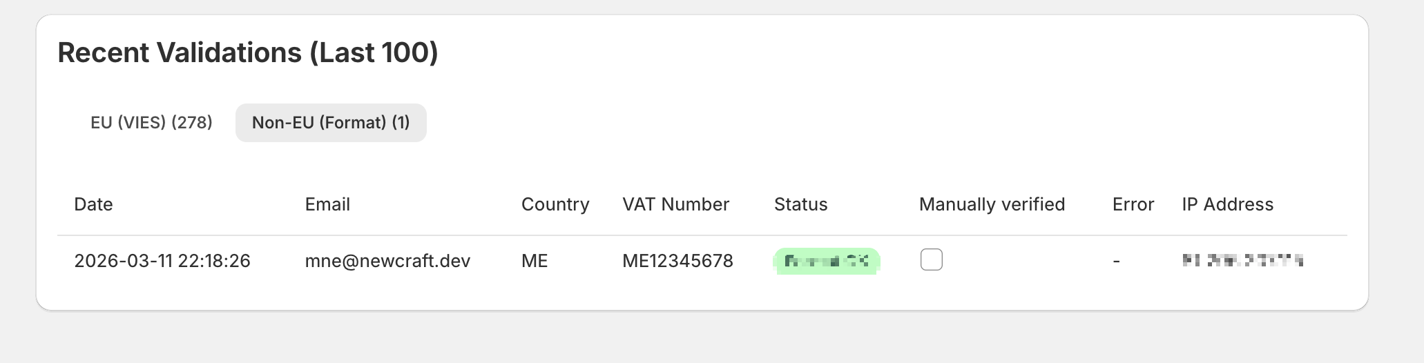 Same table structure, tailored for non-EU validations. Since there’s no centralized government registry like VIES for these countries, there’s a “Manually verified” checkbox column. When someone on your team has double-checked a non-EU tax number (through the country’s own tax authority website, for example), they tick the box. Clear record of what’s been human-verified and what hasn’t.