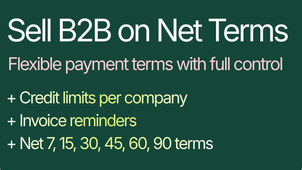This is the feature that turns a Shopify store from a “pay now” retail site into a real wholesale channel. B2B buyers expect to order on account and pay later. Net 30 is standard. Some industries run Net 60.